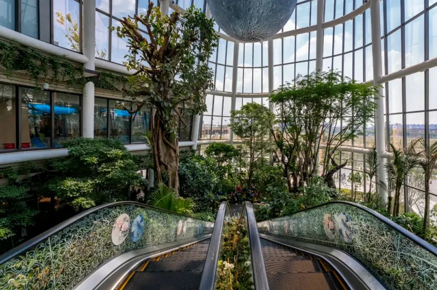 以“一日微度假勝地”為定位的上海南翔印象城MEGA,不僅融合了多元業(yè)態(tài),還巧妙地融入了植物園等自然生態(tài)元素。在建筑設計上,其外立面以“梯田山丘”為靈感,打造出上海罕見的退臺花園;在商場內(nèi)部,創(chuàng)造性地引入了森林、濕地等自然景觀,構(gòu)筑了一座占地約600平方米、高達5層、擁有200多種國內(nèi)外植物的跨層生態(tài)植物園。