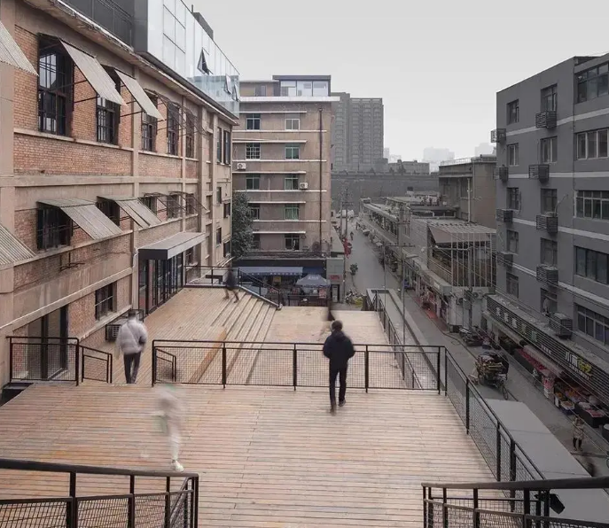 作為發(fā)起點,現(xiàn)有菜場部分被完全保留。項目最核心的“修補”有三處:連接市場入口與1、2號樓的臺階廣場,連接地面層與2號樓屋頂?shù)慕煌ㄍ玻约斑B接2號樓屋頂和3號樓的連橋。開敞的臺階廣場層層上行,不僅引導人流進入上層空間,還成為了菜場公共生活的舞臺。同時,廢舊廠房改造成了如今免費開放的藝術展區(qū),這里不定期會舉辦各式不同主題的展覽活動,已經(jīng)成為新晉網(wǎng)紅打卡盛地。