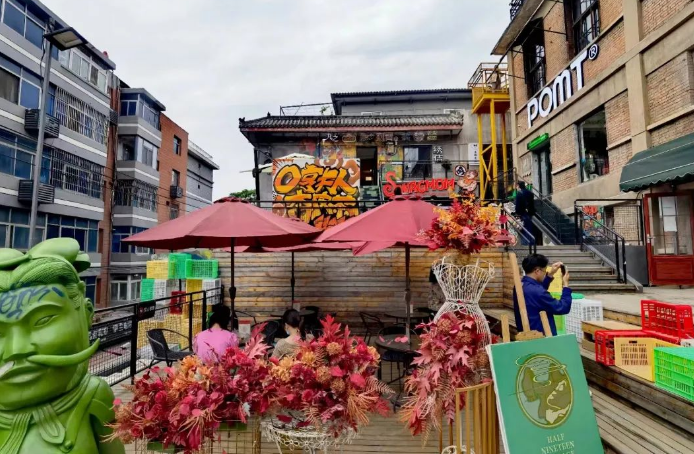 其中,信義巷子主要匯集特色小鋪,一樓布滿如陜西特產(chǎn)、小磨香油、新鮮肉鋪等門面,二樓則由咖啡館、美甲店等小店組成。每家店鋪頂部都有懸掛老菜場統(tǒng)一設計的小旗幟,既和諧統(tǒng)一又各含特色;有戲主題板塊主要以脫口秀,劇本殺,婚禮,攝影及文創(chuàng)手工等工作室等業(yè)態(tài)為主,以“有戲”為名也代表著希望,象征著新銳市井文化的希望;悅夜板塊,主要匯集酒吧、民宿等多種休閑元素。尋味板塊,則提供少燒烤、韓料、特色小吃等餐飲。