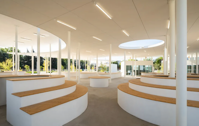 此外,廣場光滑的混凝土面層沒有路緣石,無論是步行、坐輪椅還是滑滑板都可以在市場上安全自由地移動,方便了不同人群的使用,體現(xiàn)了設計的人性化和包容性;各種街道固定裝置如白色的圓形信息板、自行車架、巨石、鳥類和昆蟲屋及社區(qū)共用桌椅等點綴其中。在極具特色的有機屋頂下,還設有帶木雕動物造型搖椅的游樂花園,為集市增添了藝術氛圍和趣味性。
